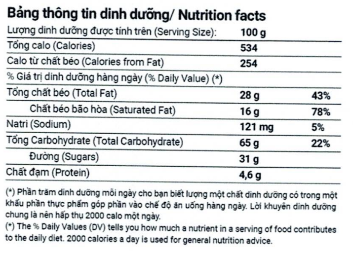 🔹Thành phần: Bột mì, Đường, Shortening (Dầu cọ tinh luyện, Chất nhũ hóa (471), Chất chống oxy hóa (320, 321)), Tinh bột sắn, Bột béo nguyên liệu, Dầu olein cọ tinh luyện, Hương liệu tổng hợp (Cốm, Vani), Chất nhũ hóa (322(i)), Muối, Chất tạo xốp (500(ii), 503(ii)), Chất tạo màu tổng hợp (102, 133), Chất hỗ trợ chế biến (Protease, Xylanase), Chất xử lý bột (341(iii)).