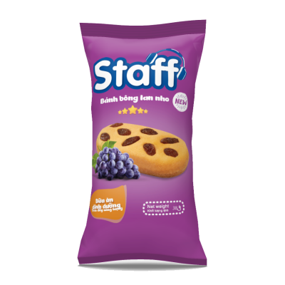 Staff Bánh Bông Lan Nho mang đến trải nghiệm tuyệt vời với lớp bánh bông lan mềm mịn, thơm béo vị trứng sữa, hòa quyện cùng những hạt nho đen khô chua ngọt tự nhiên. Hương vị hài hòa, độ ngọt vừa phải, thích hợp cho bữa sáng hoặc bữa phụ tiện lợi.