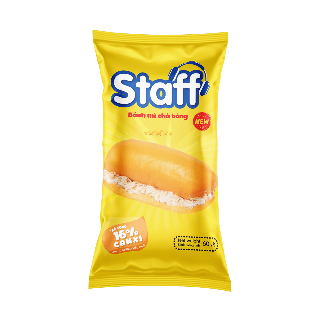 Staff Bánh Mì Chà Bông 60g là sự kết hợp hoàn hảo giữa lớp bánh mì mềm mịn, thơm bơ và nhân chà bông mặn mà hòa quyện cùng sốt đậm đà, tạo nên hương vị hấp dẫn, lôi cuốn ngay từ miếng cắn đầu tiên.