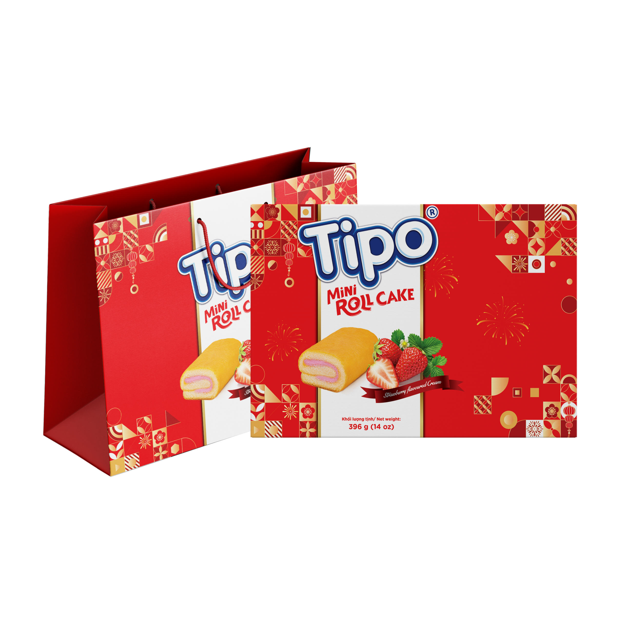 Tipo Bánh Bông Lan Cuộn Kem Hương Dâu 396g được đóng hộp giấy cứng cáp, có túi xách bằng giấy bên ngoài.