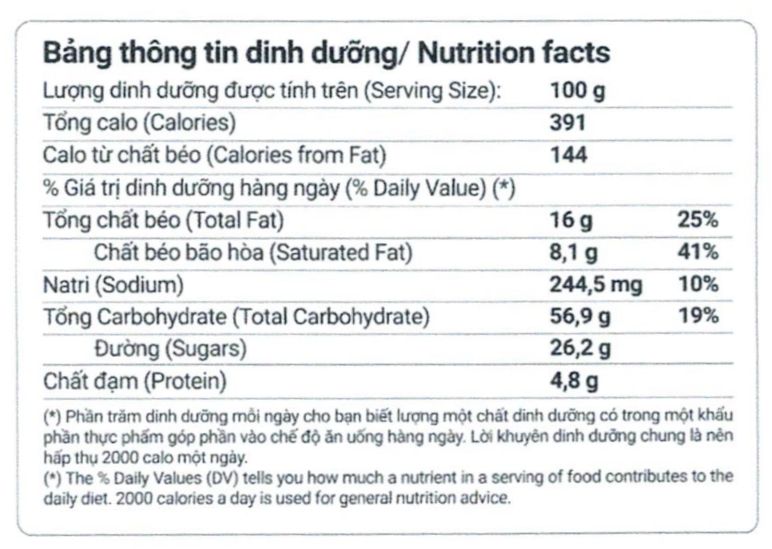 🔹Thành phần: Bột mì, Trứng gà, Đường, Dầu thực vật (Dầu cọ (có chứa chất chống oxy hóa (320, 321)), Dầu hướng dương), Chất làm ẩm (422, 420(ii), 1520), Mạch nha maltose, Nước, Đường dextrose, Mạch nha glucose, Bột whey, Sữa đặc có đường, Chất nhũ hóa (477, 471, 472e, 322(i), 475, 491, 433), Chất điều chỉnh độ acid (330), Chất tạo xốp (500(ii), 341(i), 450(i)), Muối, Chất bảo quản (281), Hương liệu tổng hợp (Xoài, Bơ), Tinh bột ngô, Chiết xuất quả xoài (0,068%), Chất làm dày (415), Maltodextrin, Chất tạo màu tổng hợp (160a(i)), Chất tạo màu tự nhiên (100(i)).