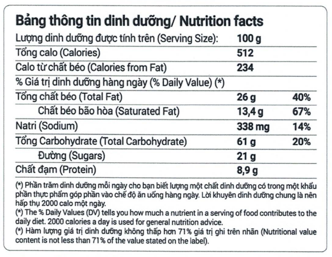 🔹Thành phần: Bột mì, Đường, Shortening, Bơ, Trứng gà, Vảy ngũ cốc yến mạch (4,37%), Hạt điều (2,59%), Cơm dừa sấy, Bơ đậu phộng, Maltodextrin, Chiết xuất cà phê (1,03%), Muối, Chất nhũ hóa (322(i)), Chất tạo xốp (500(ii), 450(i), 503(ii)), Hương liệu tổng hợp (Vani).