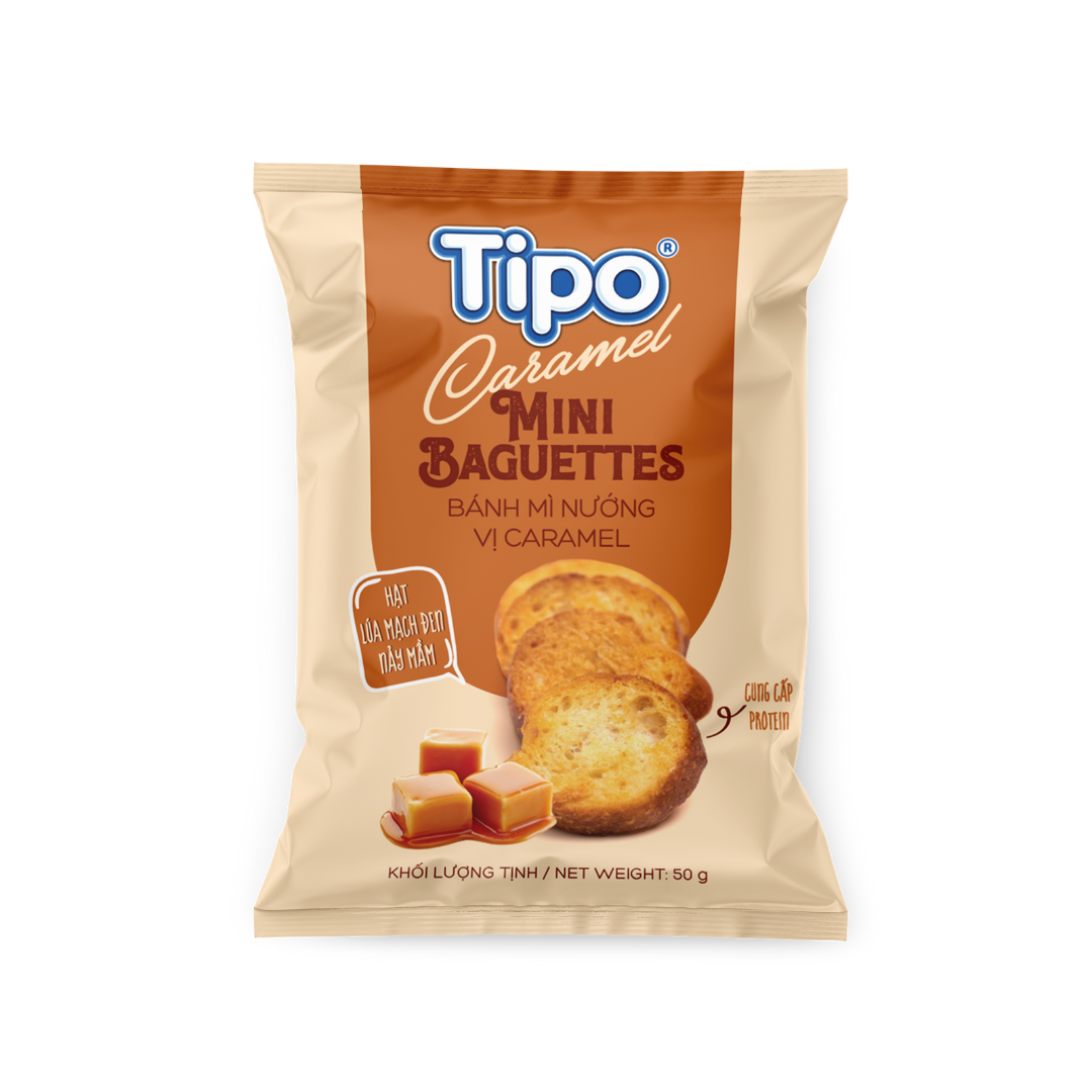 Tipo Bánh Mì Nướng Caramel là phiên bản bánh mì nướng ngọt nhẹ, với lớp caramel phủ mỏng bên ngoài lát bánh mì cắt mỏng. Khi thưởng thức, bánh tan giòn trong miệng, mang lại vị ngọt vừa phải và mùi caramel thơm dịu, phù hợp cho nhiều độ tuổi.