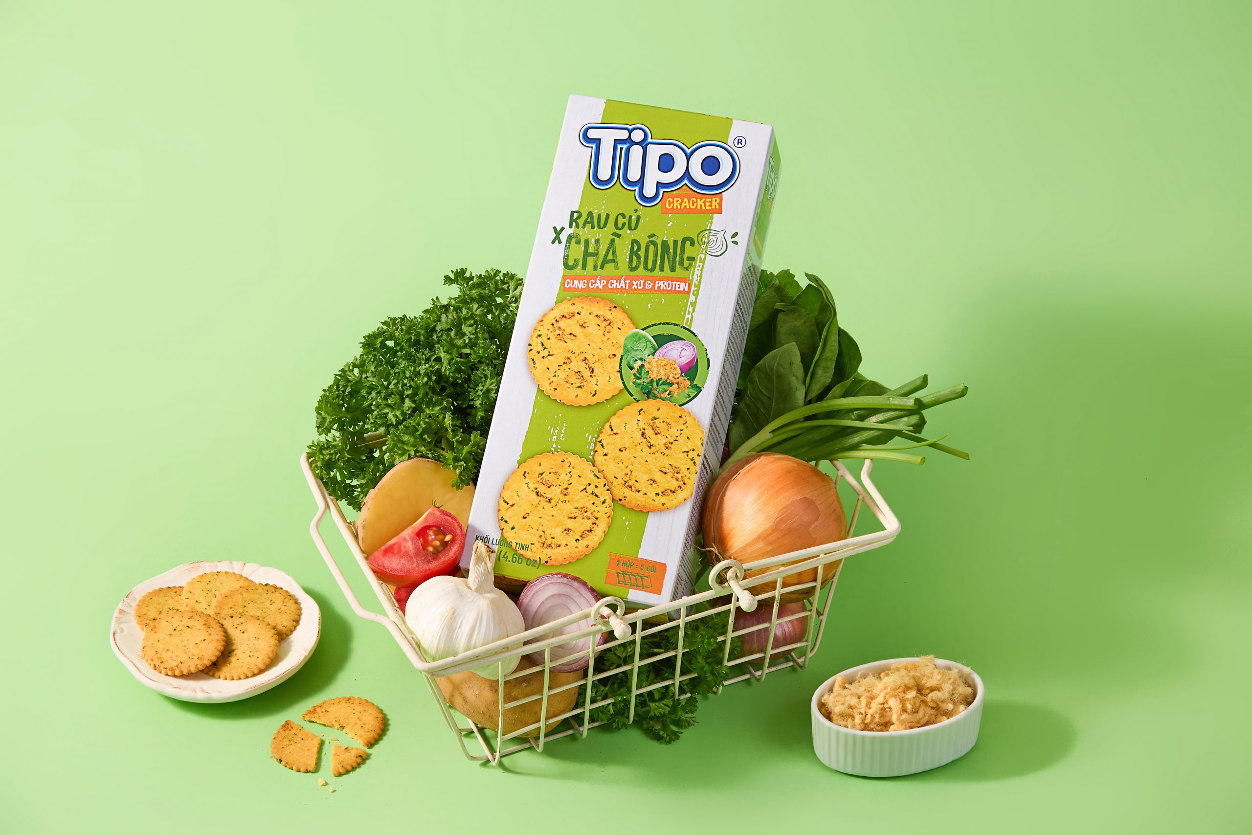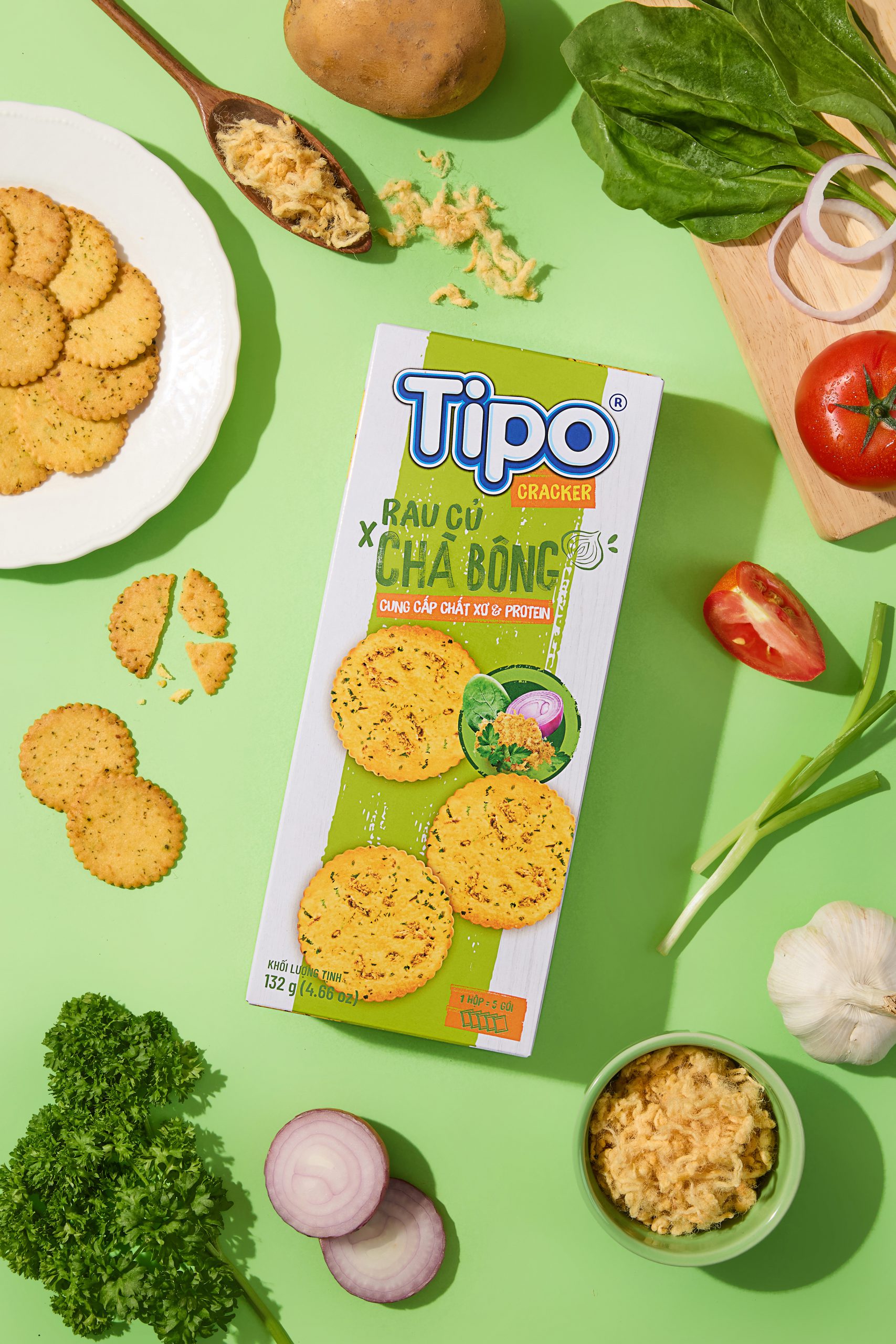 Tipo Cracker Rau củ Chà bông là lựa chọn ăn vặt mới mẻ, kết hợp độc đáo giữa 8 loại rau củ: Khoai tây, Hành tây, Hành tím, Tỏi, Hành lá, Cà chua, Rau mùi tây, Rau chân vịt; và chà bông gà thơm ngon, mang đến trải nghiệm giòn rụm – đậm vị – giàu dinh dưỡng.