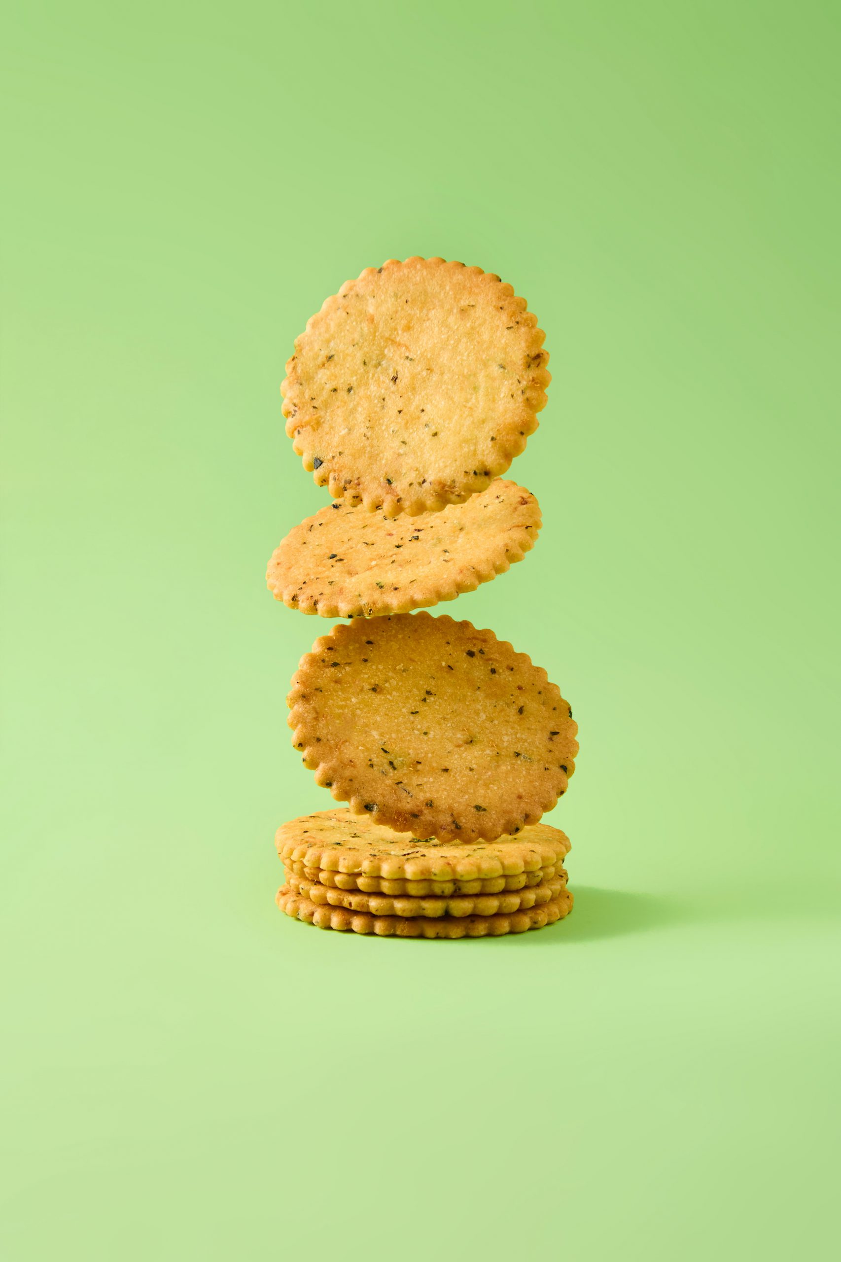 🔹Hương vị, kết cấu: Bánh cracker mỏng giòn tan vị rau củ và chà bông. Kết cấu: Bánh tròn mỏng vàng ươm với chà bông, rau củ trong cốt bánh.