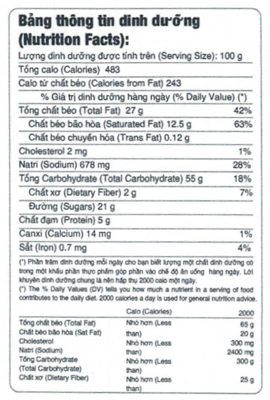 🔹Thành phần: Bột mì, Dầu cọ tinh luyện, Đường, Tinh bột khoai tây (7,6%), Chất xơ từ yến mạch (1,7%), Maltodextrin, Xốt gia vị (1,16%) *(Có chứa: 37% rau củ (Hành tây, Hành tím, Tỏi, Hành lá, Cà chua), Vảy khoai tây (1,1%), Muối, Chất nhũ hóa (322(i)), Chất tạo xốp (500(ii), 503(ii), 450(i), 341(i)), Chà bông gà (0,55%) (Thịt gà, Đường, Dầu cọ olein tinh luyện), Bột gia vị hương gà, Nước mắm, Chất điều vị (621), Chất bảo quản (200)), Rau sấy khô (0,2%) (Rau mùi tây, Rau chăn vịt), Hương liệu tổng hợp (Khoai tây), Chất xử lý bột (223), Chất hỗ trợ chế biến (Enzym serin proteinase, Enzym protease), Chất tạo màu tổng hợp (160a(ii)).